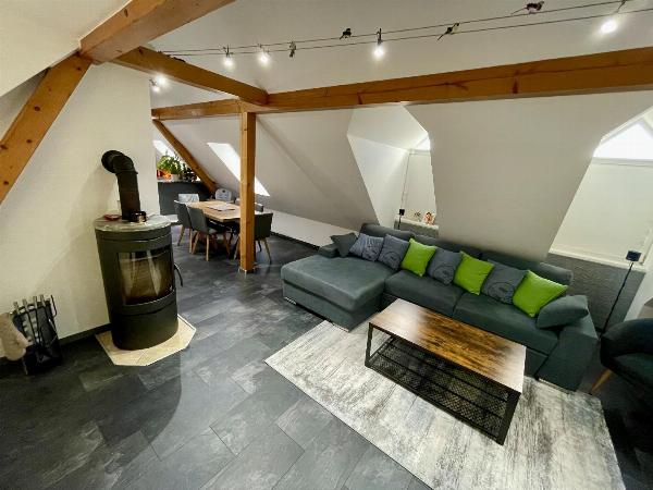 Diese schöne Wohnung mit Garten verfügt weiters über einen großen offenen Wohn-, Küchen- und Essbereich, der zusätzlich mit einem Schwedenofen beheizt werden kann.